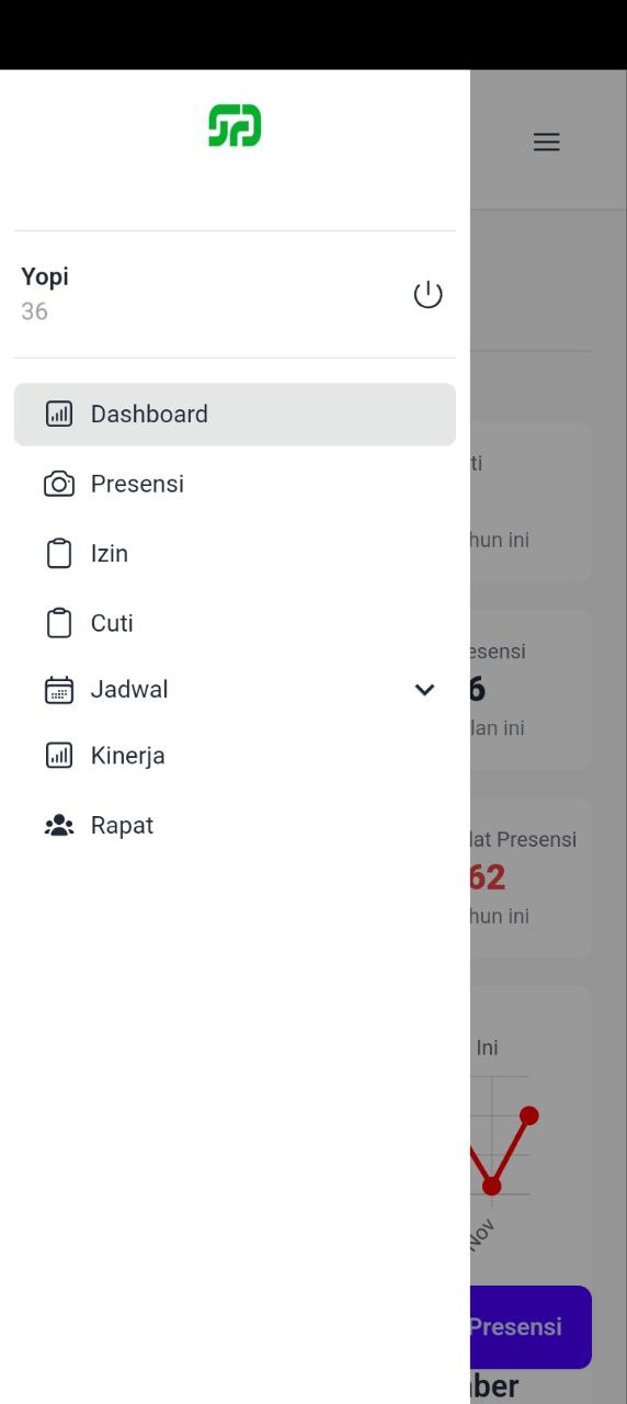 untuk Melihat rekapan absen, jadwal menu lain silahkan klik menu icon hamburger (- tiga), pada pojok kanan atas