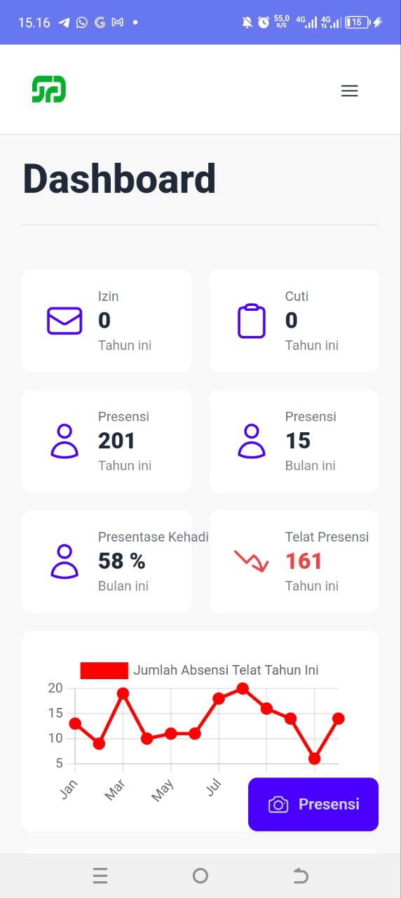Jika login berhasil anda akan di arahkan ke halaman dashboard absen dan icon prepensi pada dashboard.